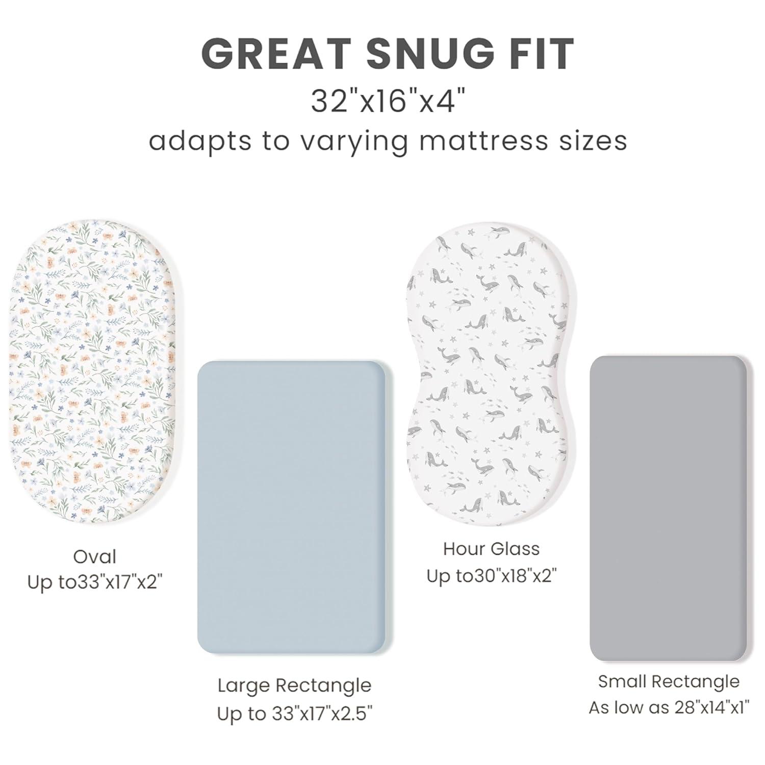 Universal Fit for Most Bassinet Mattresses: These bassinet mattress sheets (32″ x 16″) fit most bassinet mattresses, including oval, round, rectangle, and hourglass shapes. The elasticized edges provide a snug, secure fit for added safety