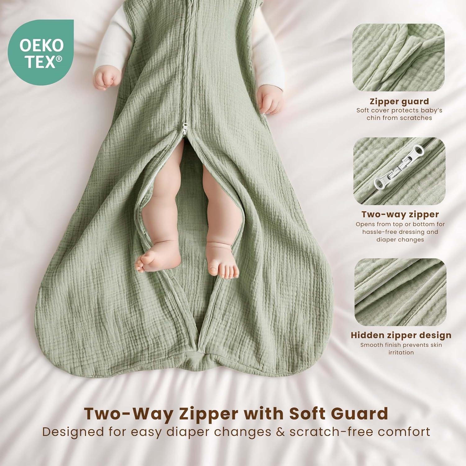 Double-Layer Muslin for Breathable Comfort: Crafted from OEKO-TEX certified muslin cotton with a soft double-layer design, this wearable blanket offers gentle warmth and breathability—perfect for naps and bedtime in warmer rooms or transitional seasons. Each set includes 2 sleep sacks—one in a solid color and one with a delicate print—blending comfort and style for everyday rotation in your nursery.
