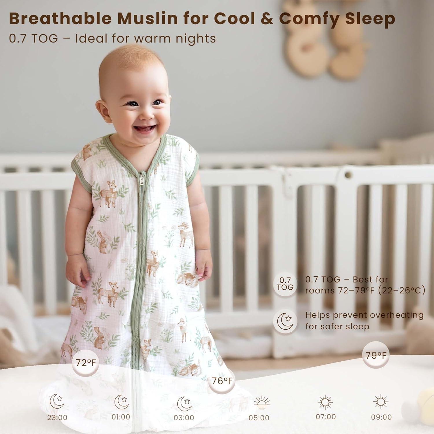 0.7 TOG for Gentle Temperature Regulation: Designed with a 0.7 TOG rating, this muslin sleep sack provides just the right amount of lightweight warmth for babies who tend to run warm. It helps maintain a steady, cozy temperature without overheating—perfect for spring, summer, and air-conditioned rooms.