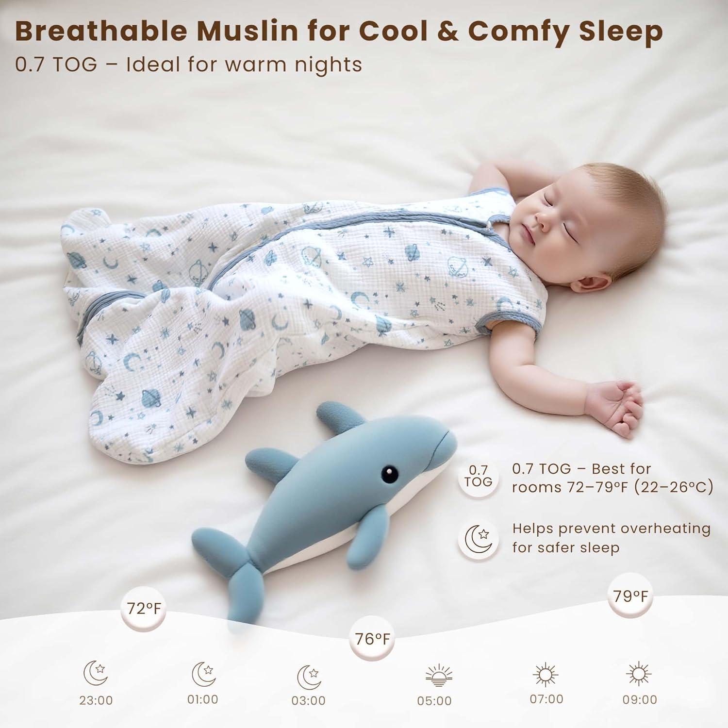 0.7 TOG for Gentle Temperature Regulation: Designed with a 0.7 TOG rating, this muslin sleep sack provides just the right amount of lightweight warmth for babies who tend to run warm. It helps maintain a steady, cozy temperature without overheating—perfect for spring, summer, and air-conditioned rooms.
